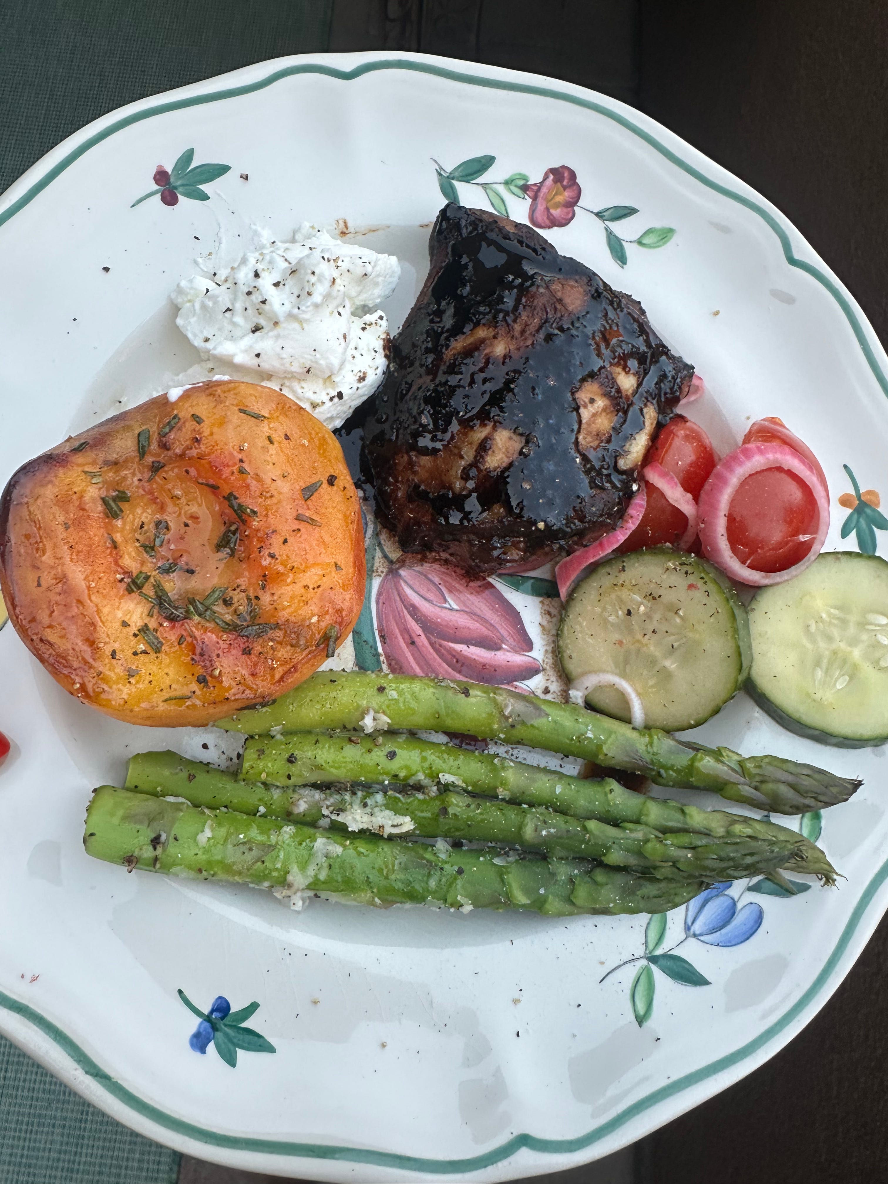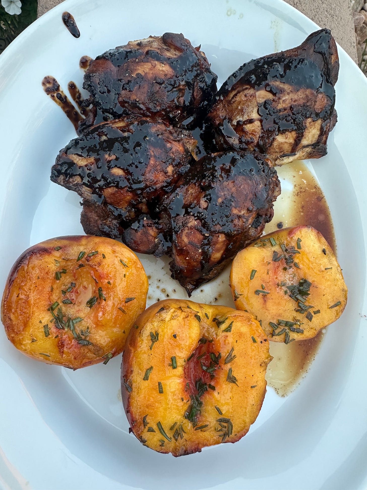 Melissa’s recipes are nearly always fool-proof, easy, and big on flavor. And her gingery grilled chicken thighs with charred peaches are no exception. The marinade includes, of course, ginger, but also balsamic vinegar that gave the dish a nice, subtle tang and a tiny bit of sweetness to go with the peaches.
